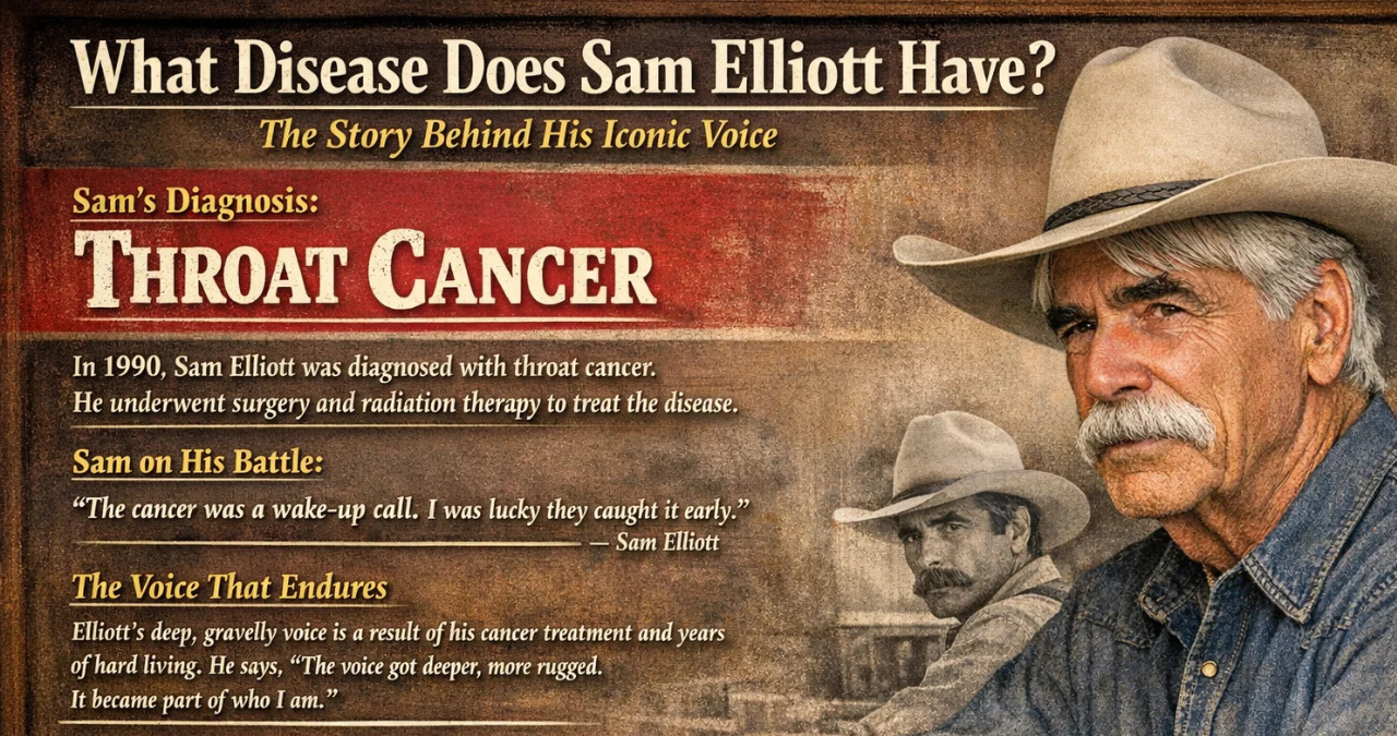 what disease does Sam Elliott have The confusion arose because the public first noticed a symptom—a change in his voice—without immediate context. Before Elliott’s candid disclosure, the internet filled the information vacuum with speculation. The direct answer to what disease does Sam Elliott have is throat cancer, and his own statements have now permanently clarified the situation, ending the cycle of misinformation.